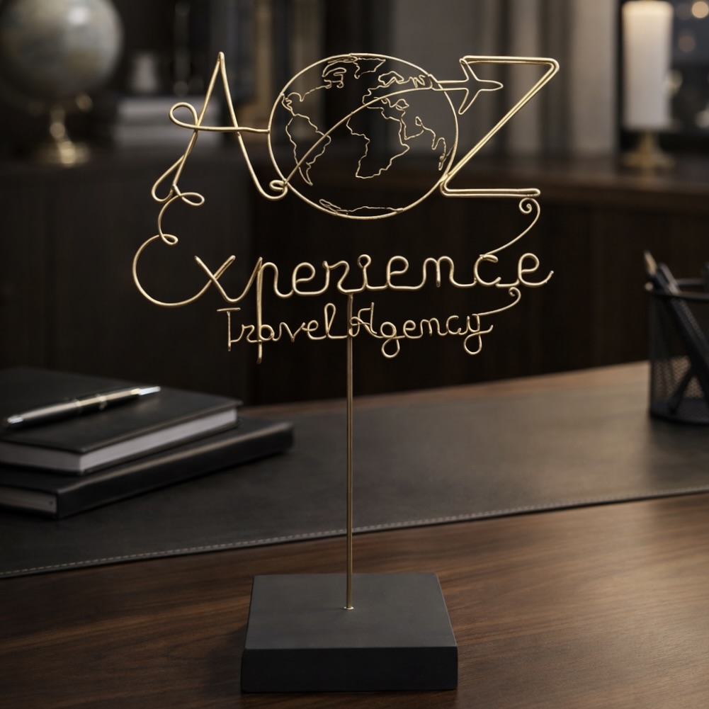 Une pièce artistique faite à la main en fil métallique, représentant le nom de votre agence avec un design élégant intégrant un globe et un avion. Ce logo décoratif est parfait pour les agences de voyage, bureaux ou comptoirs d’accueil, apportant une touche originale et professionnelle à votre espace.